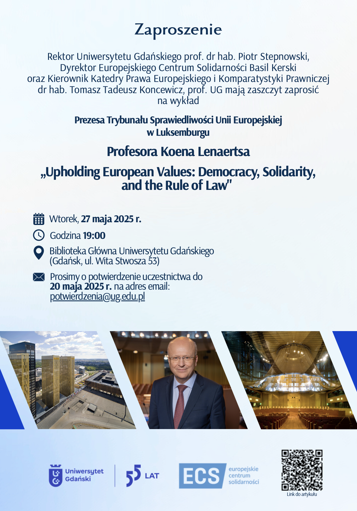 W imieniu Rektora Uniwersytetu Gdańskiego prof. dr hab. Piotra Stepnowskiego, Dyrektora Europejskiego Centrum Solidarności Basila Kerskiego oraz Kierownika Katedry Prawa Europejskiego i Komparatystyki Prawniczej dr hab. Tomasza Tadeusza Koncewicza, zapraszamy na wykład Profesora Koena Lenaertsa, Prezesa Trybunału Sprawiedliwości Unii Europejskiej w Luksemburgu, który odwiedzi Uniwersytet Gdański w ramach obchodów 55-lecia UG.