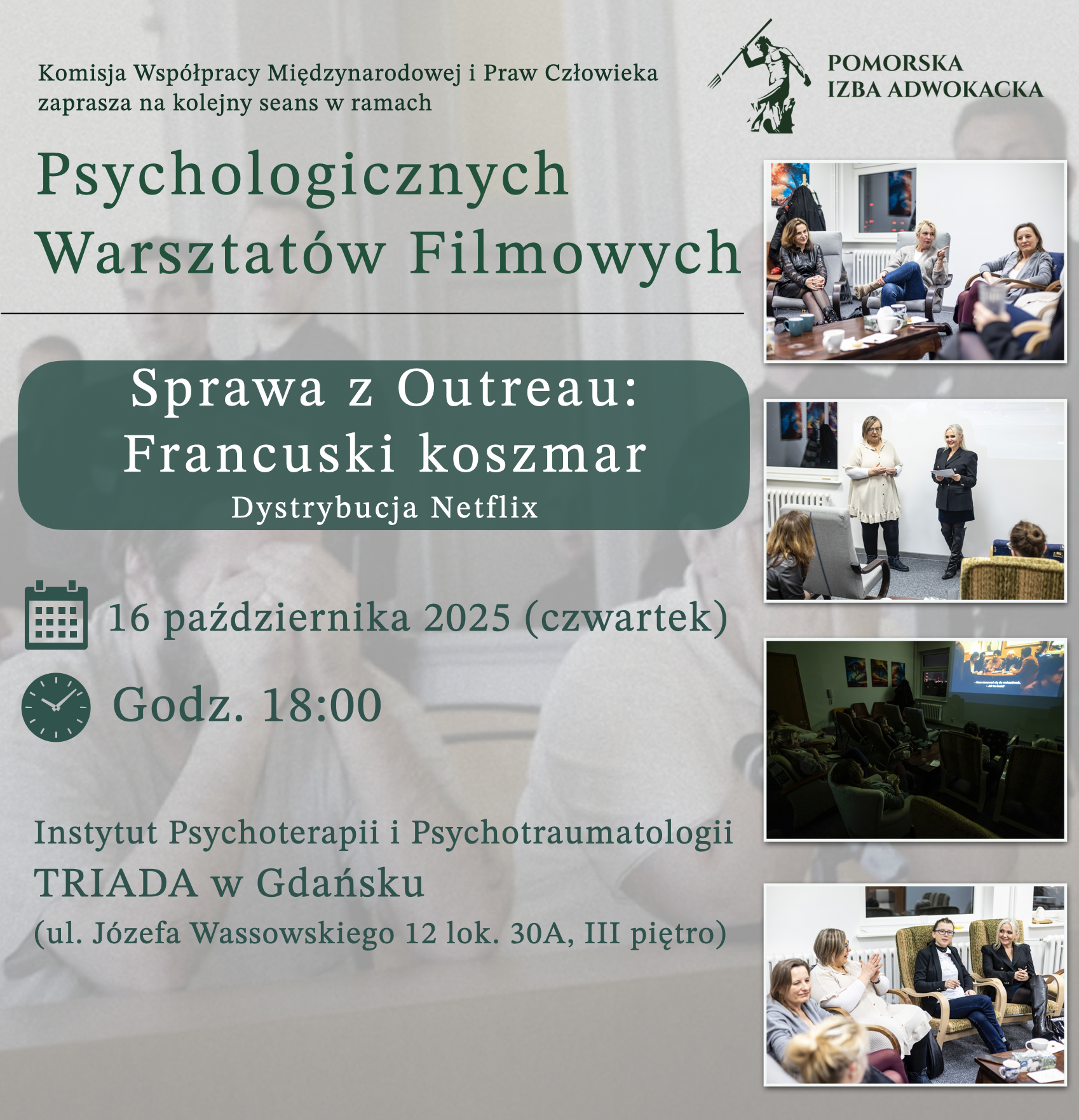 Zapraszamy na film w ramach nowej edycji Psychologicznych Warsztatów Filmowych dla Adwokatów i Aplikantów Adwokackich organizowanych pod auspicjami PIA przez Komisję Współpracy Zagranicznej i Praw Człowieka będącej kontynuacją projektu „Adwokat to też Człowiek”. Najbliższe warsztaty odbędą się w czwartek 16 października 2025 r. o godz. 18.00 w sali wykładowej Instytutu Psychoterapii i Psychotraumatologii TRIADA w Gdańsku przy ul. J.Wassowskiego 12 lok. 30 A (III piętro).