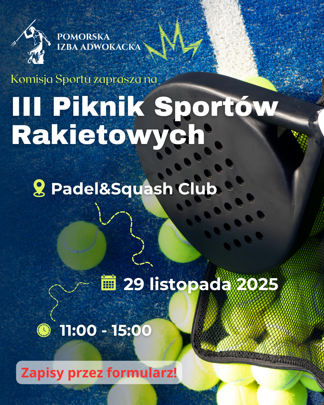 Serdecznie zapraszamy Adwokatów i Aplikantów Pomorskiej Izby Adwokackiej wraz z Rodzinami do spędzenia z nami sportowej soboty i wzięcia udziału w III Pikniku sportów rakietowych, który odbędzie się