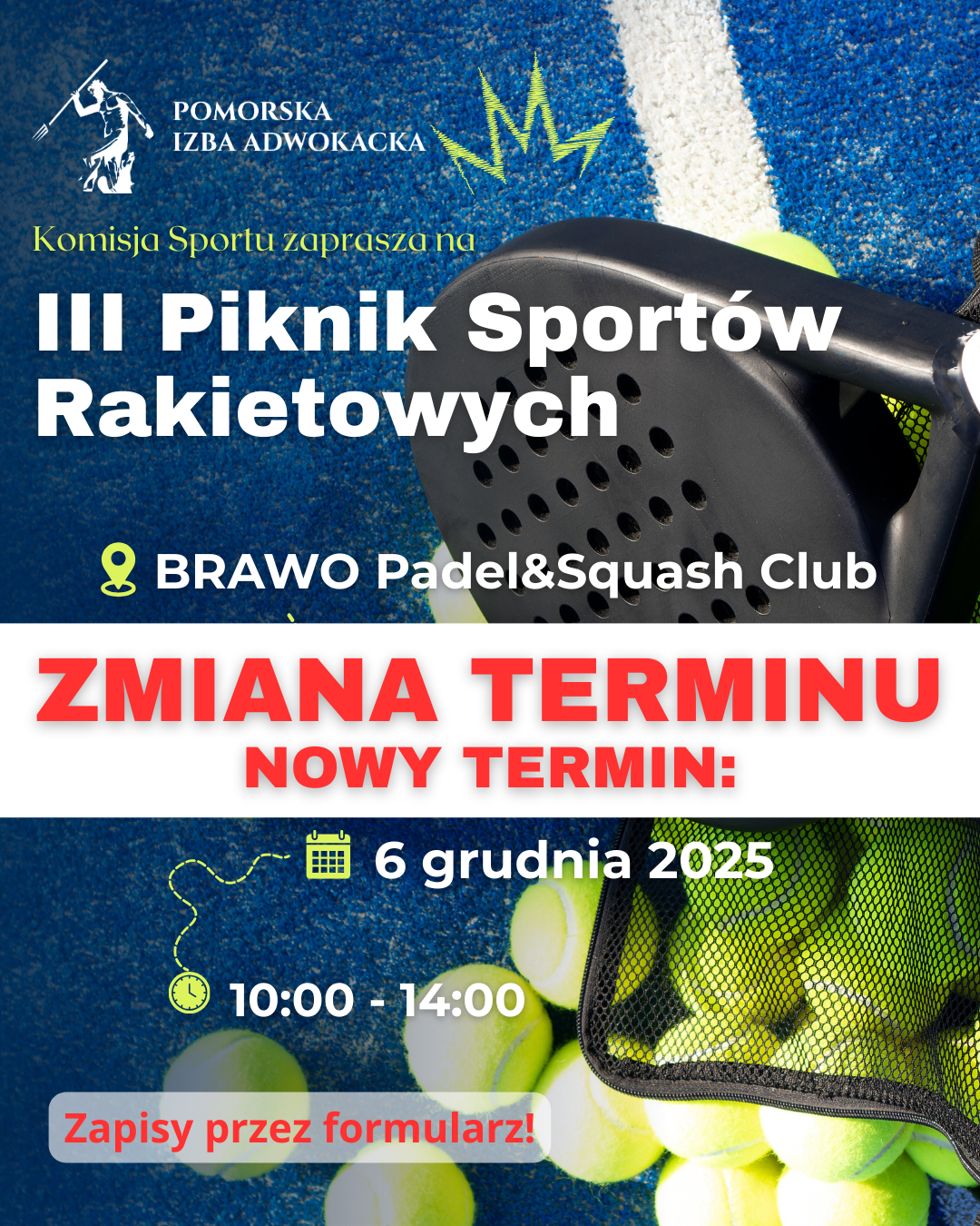 informujemy, że z uwagi na zaplanowane w dniu 29 listopada 2025 roku uroczystości pogrzebowe śp. adw. Dariusza Olszaka, Prezesa Sądu Dyscyplinarnego Pomorskiej Izby Adwokackiej, postanowiliśmy przełożyć termin III Pikniku Sportów Rakietowych. Nowy termin wydarzenia to