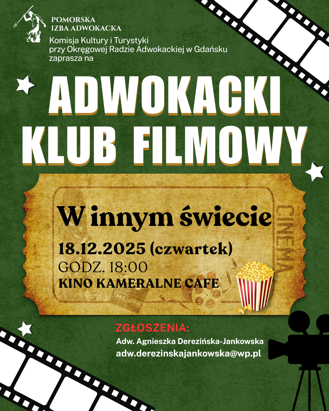 W imieniu Komisji Kultury i Turystyki przy Okręgowej Radzie Adwokackiej w Gdańsku serdecznie zapraszamy Aplikantów i Adwokatów Pomorskiej Izby Adwokackiej na ostatni w tym roku seans organizowany w ramach Adwokackiego Klubu Filmowego!
