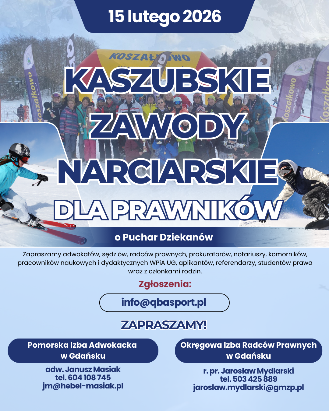W zawodach (narciarstwo alpejskie i snowboard) będą mogli wziąć udział adwokaci, sędziowie, radcy prawni, prokuratorzy, notariusze, komornicy i prawnicy „naukowcy” z Wydziału Prawa UG, aplikanci wszystkich samorządów, referendarze, studenci prawa i – co najważniejsze – członkowie ich rodzin, w tym (szczególnie!) dzieci. W tych zawodach nie będzie przegranych! Planujemy kilka dziecięcych kategorii wiekowych (z podziałem na dziewczynki i chłopców), a także kilka „dorosłych”, odrębnie dla nieco starszych dziewcząt i wiecznych młodzieńców. Planujemy również zawody snowboardowe. Bardzo ważna będzie też kategoria rodzinna.