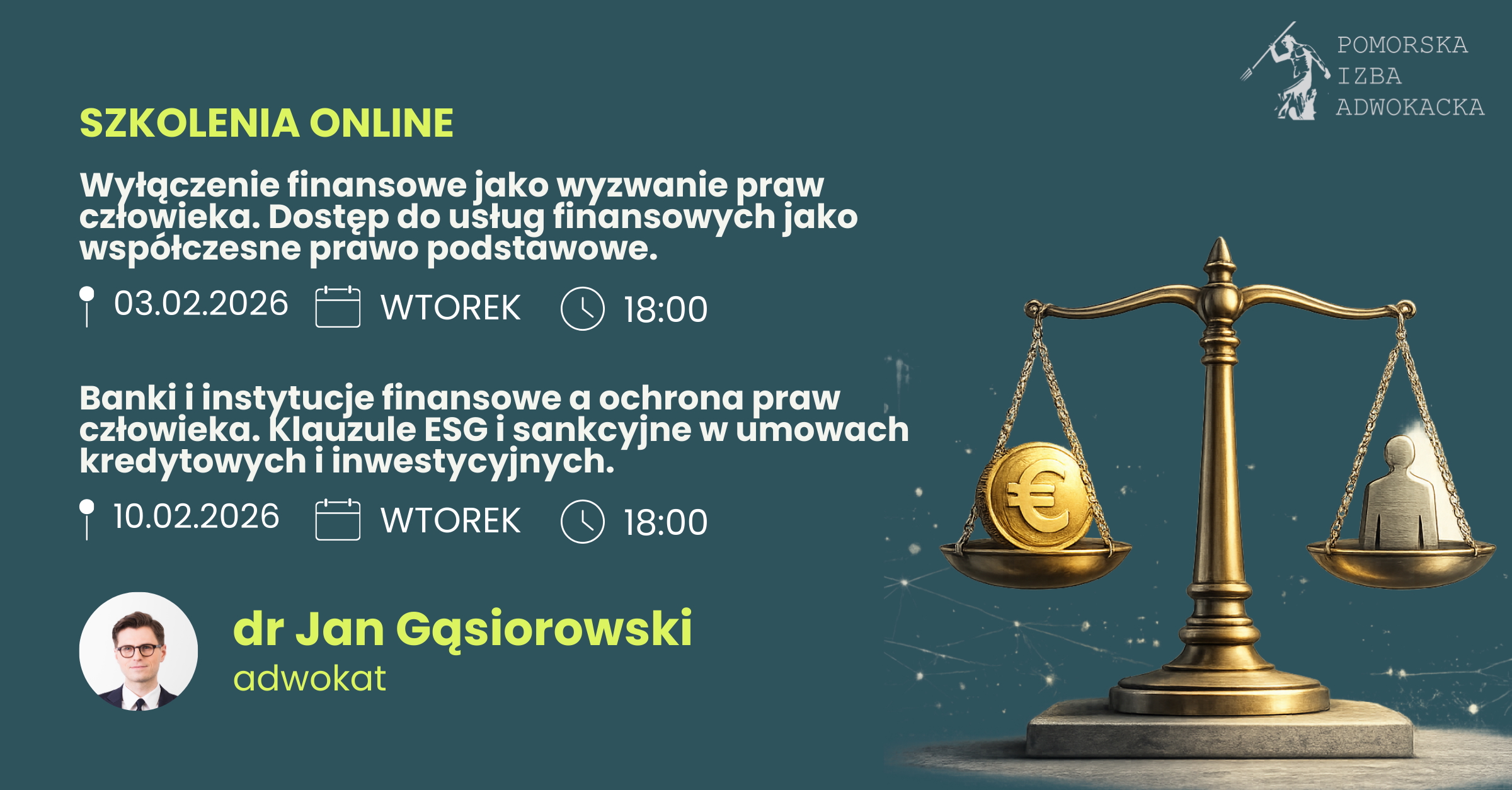 Komisja Współpracy Międzynarodowej i Praw Człowieka przy Okręgowej Radzie Adwokackiej w Gdańsku serdecznie zaprasza na szkolenia on-line pt. „Rola adwokata w dostępie do usług finansowych i obsłudze sektora finansowego w kontekście praw człowieka”.