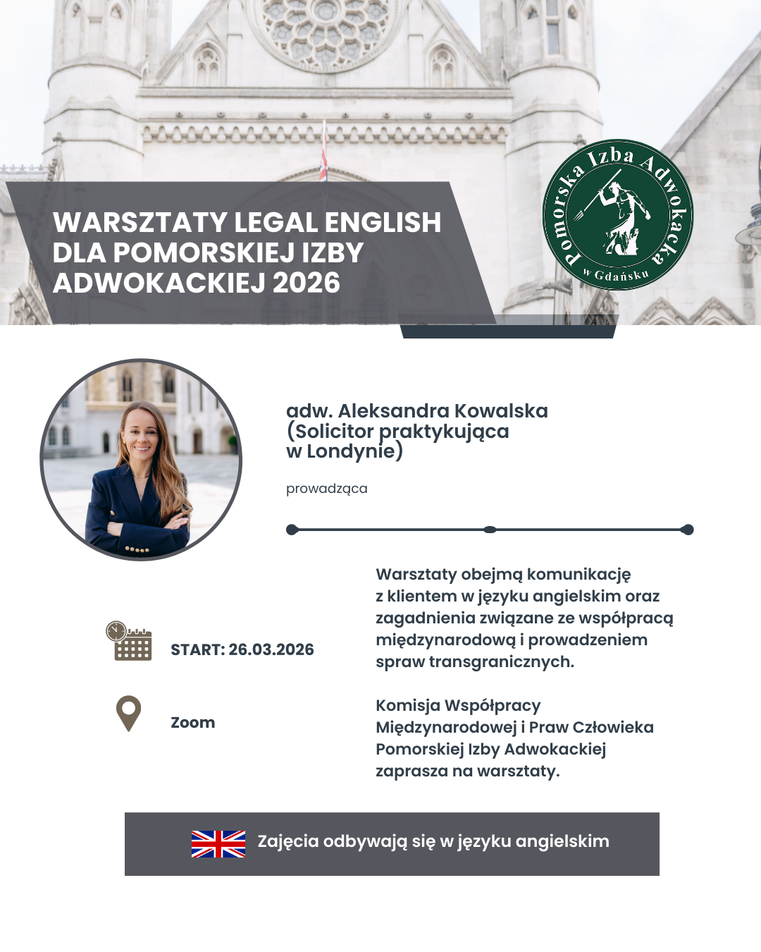Zajęcia poprowadzi adw. Aleksandra Kowalska praktykująca w Londynie jako solicitor.