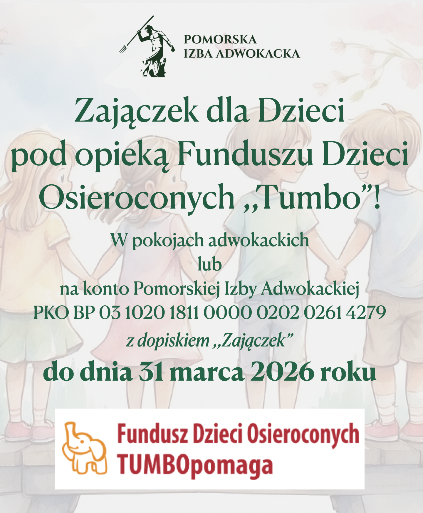 W związku z tym proszę o udział w akcji do dnia 31 marca 2026 r. poprzez wsparcie finansowe do puszek znajdujących się w Pokojach Adwokackich bądź wpłaty na konto PKO BP 03 1020 1811 0000 0202 0261 4279 z dopiskiem „Zajączek”.
